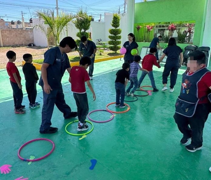 Durante la jornada se cuenta con la participación de estudiantes de la Universidad Cuauhtémoc de la carrera de Fisioterapia, quienes llevan acabo dinámicas con las niñas y niños con autismo, enfocándose en el reconocimiento del cuerpo, la coordinación y el movimiento mediante el juego, sonidos y material didáctico, que permitirá fortalecer las habilidades en coordinación motriz y conciencia del espacio.