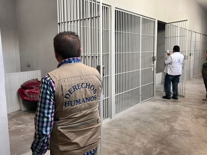 El personal de la CNDH, integrado por José María Morales y el médico Lenin Pedro Sánchez, recorrió las instalaciones la zona de Barandilla y revisó las áreas relacionadas que complementan el trabajo de los oficiales al momento de realizar detenciones, tanto por faltas administrativas como por los casos en los que se procede con la puesta a disposición de la autoridad competente.