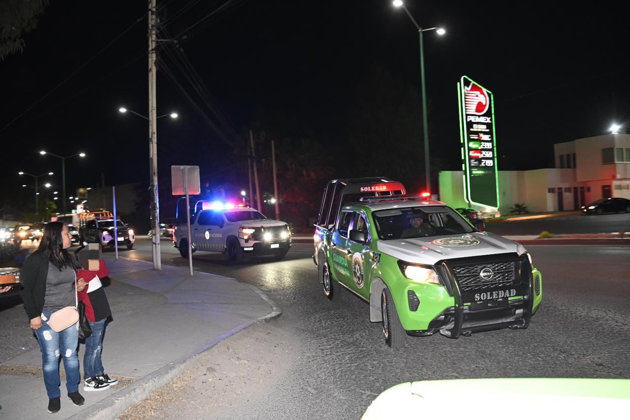 Con el propósito de mantener la tendencia a la baja de la incidencia delictiva en el municipio de Soledad de Graciano Sánchez, tal y como lo instruye el Alcalde, Juan Manuel Navarro Muñiz, la Guardia Civil Municipal colabora y encabeza el dispositivo Convoy, integrado por fuerzas estatales y municipales de Villa de Pozos, así como de la Guardia Nacional, recorriendo avenidas, calles, colonias y comunidades con el objetivo de brindar auxilio, fortalecer la presencia policial y reforzar la proximidad social con la ciudadanía.