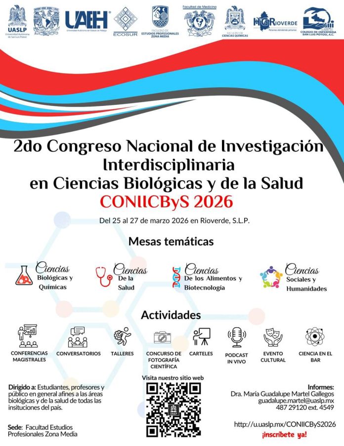 Con el objetivo de promover la colaboración científica y la generación de conocimiento mediante conexiones interdisciplinarias en las áreas de ciencias biológicas y de la salud, la doctora María Guadalupe Martel Gallegos, catedrática de la Facultad de Estudios Profesionales Zona Media (FEPZM) de la Universidad Autónoma de San Luis Potosí (UASLP), invitó a la comunidad científica del estado a participar en el 2° Congreso Nacional de Investigación Interdisciplinaria de Ciencias Biológicas y de la Salud (CONIICByS 2026), que se realizará los días 26 y 27 de marzo en el Campus Rioverde.