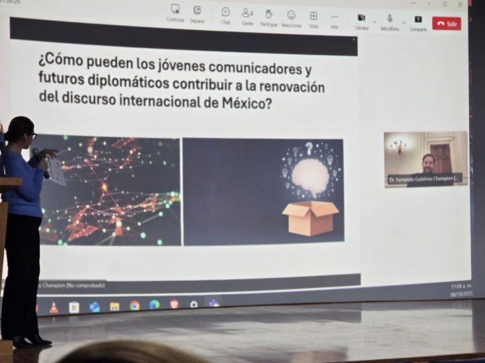 Estudiantes de la Facultad de Ciencias de la Comunicación (FCC) de la Universidad Autónoma de San Luis Potosí (UASLP) conocieron el impacto de la comunicación diplomática que desarrolla el personal del Servicio Exterior Mexicano, a través de una charla virtual impartida en el auditorio de la entidad por el doctor Luis Fernando Gutiérrez Champion, Cultural Counselor & Press Attaché de la Embajada de México en el Reino Unido.