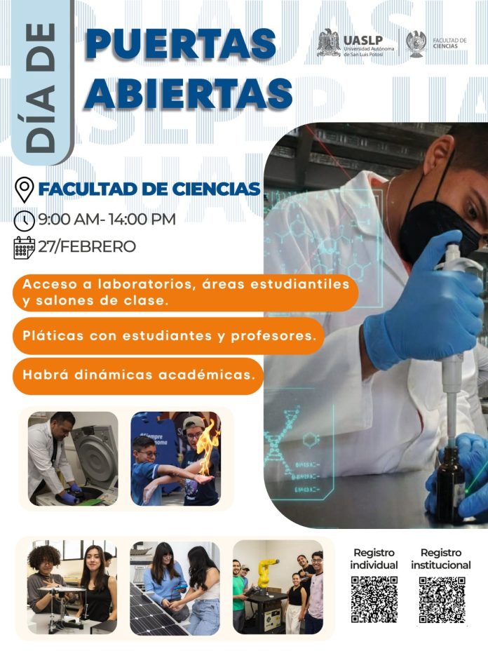 La Facultad de Ciencias de la Universidad Autónoma de San Luis Potosí (UASLP), en el marco del proceso de Admisión 2026, llevará a cabo el viernes 27 de febrero el Día de Puertas Abiertas, dirigido a estudiantes de bachillerato interesados en conocer el campus Pedregal y la oferta académica de la entidad.