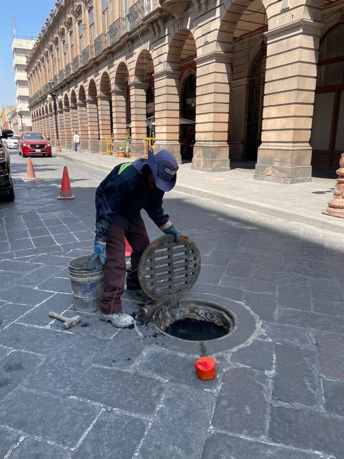 SLP.- Como parte de las acciones del programa integral de limpieza en el Centro Histórico previo al período vacacional, Interapas llevó a cabo la instalación de biocubos en la red de drenaje sanitario con el objetivo de disminuir los malos olores que se generan en esta zona.