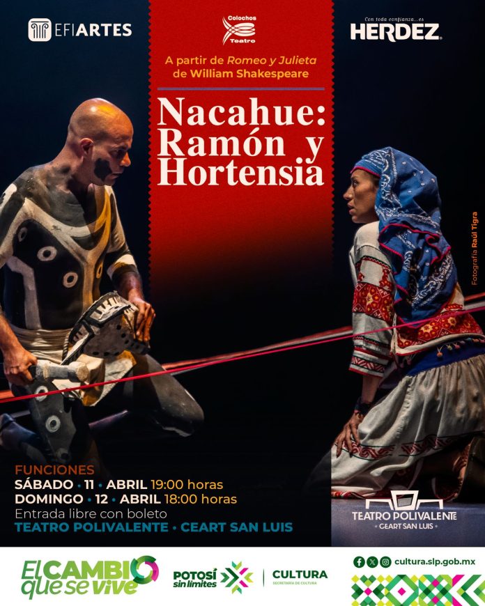 Nacahue: Ramón y Hortensia, producción distribución nacional de Cacumen Producciones y Los Colochos Teatro,se presentará con dos únicas funciones en el Teatro Polivalente del CEART de San Luis Potosí, el sábado 11 y domingo 12 de abril a las 19 y 18 horas respectivamente, la entrada es libre, los boletos se entregarán a partir del miércoles 8 de abril en las taquillas del Teatro Polivalente y en la Secretaría de Cultura o bien se puede reservar en el link: https://forms.gle/6LP5xq9BHQGAciAD7