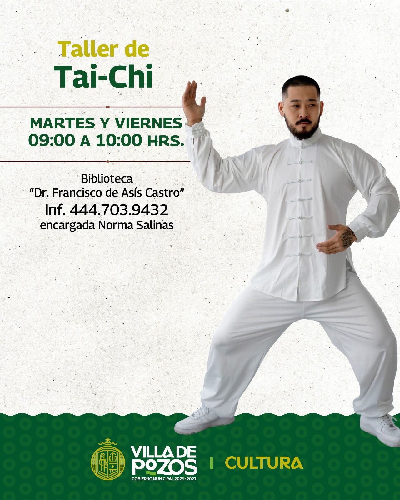 El Taller de Tai-Chi, se lleva a cabo en la Biblioteca Municipal todos los martes y jueves en un horario de 9:00 a 10:00 de la mañana.