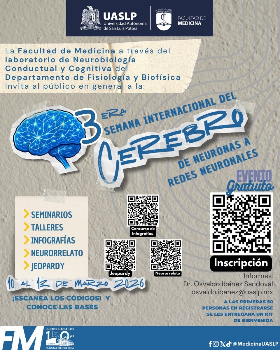 La Facultad de Medicina de la Universidad Autónoma de San Luis Potosí (UASLP), a través del Laboratorio de Neurobiología Conductual y Cognitiva del Departamento de Fisiología y Biofísica, realizará la tercera Semana Internacional del Cerebro: “De neuronas a redes neuronales”, un encuentro académico y de divulgación científica que busca acercar el conocimiento sobre el funcionamiento del cerebro a la sociedad.