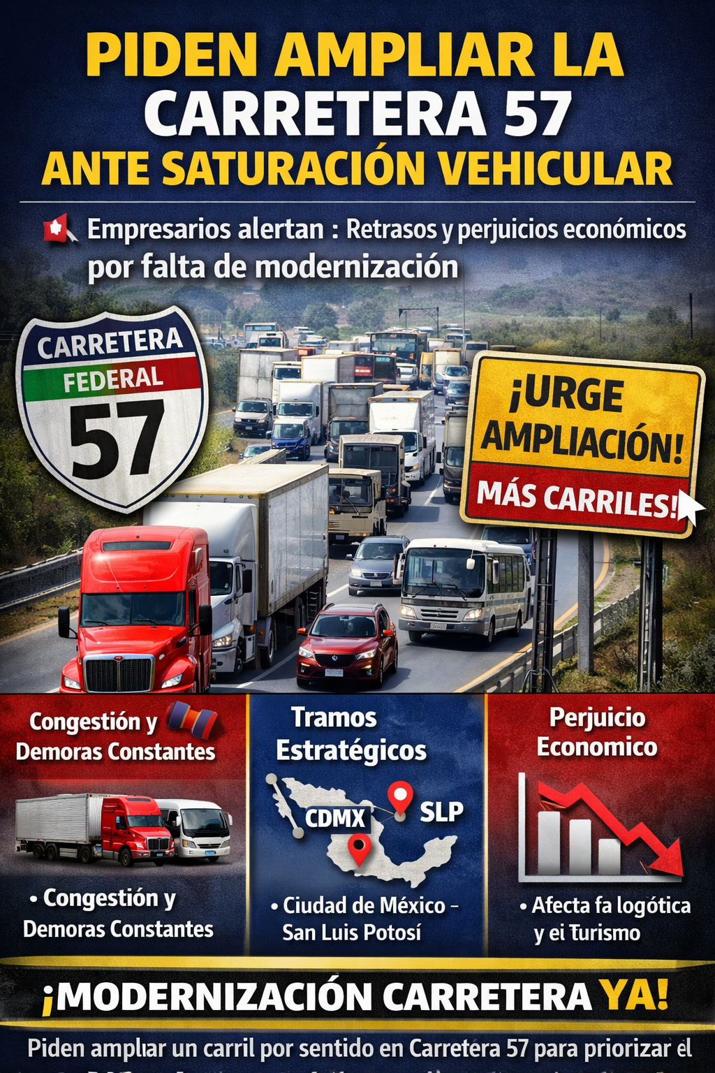 La ampliación de la Carretera Federal 57 es una necesidad urgente que debe ser atendida por el gobierno federal, debido a la alta carga vehicular que diariamente provoca congestionamientos y colapsos en distintos tramos de esta vía estratégica del país. Así lo señaló Alejandro Hernández García, directivo de la empresa Conejos Tour.