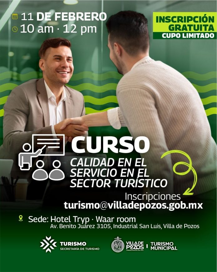 Con el objetivo de fortalecer la atención y profesionalización de los prestadores de servicios turísticos, la Dirección de Turismo Municipal de Villa de Pozos, lanzó la convocatoria para participar en la capacitación “Calidad en el Servicio en el Sector Turístico”, que se llevará a cabo el miércoles 11 de febrero, impartida por personal especializado de la Secretaría de Turismo del Estado.