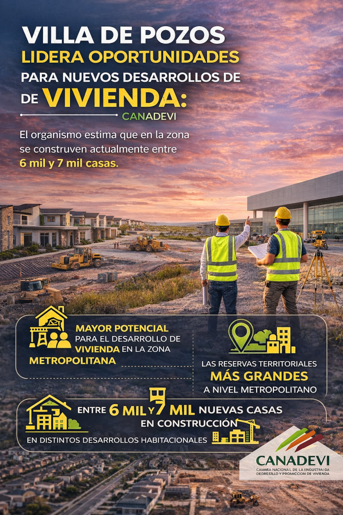 El municipio de Villa de Pozos concentra actualmente la mayor vocación para el crecimiento del sector inmobiliario dentro de la zona metropolitana de San Luis Potosí, afirmó Luis Fernando Lárraga Escobedo, presidente local de la Cámara Nacional de la Industria de la Promoción y Desarrollo de Vivienda (CANADEVI).